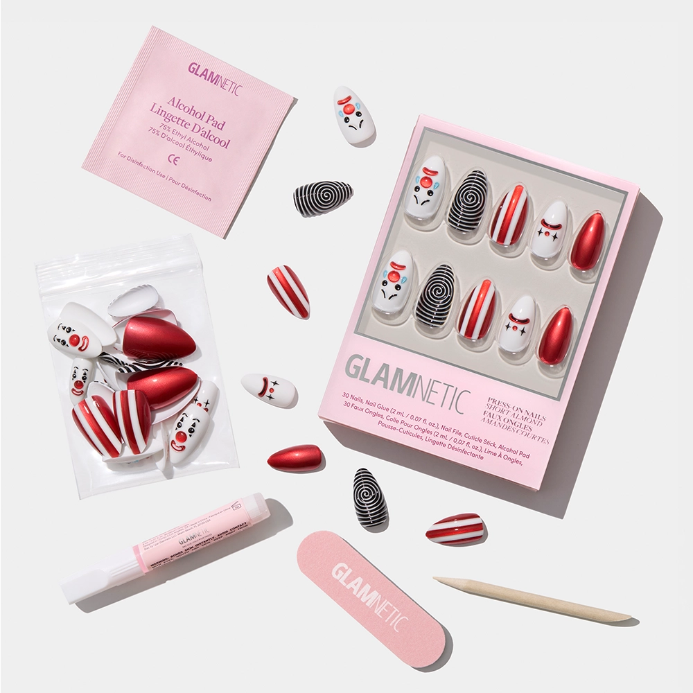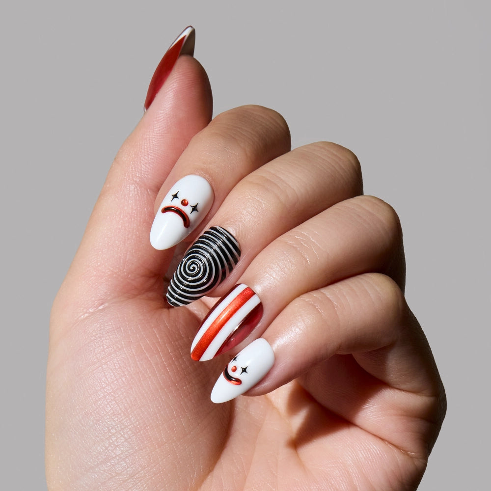 Not all clowns are here to play. Crybaby Clown is your one-way ticket into the center ring. From 3D clown motif accent nails, to solid red chrome and dizzying black-and-white swirls, this short almond nail was made to steal the spotlight. For ultimate shine and longevity, be sure to pair with our UV Gel Top Coat & Handheld UV LED Lamp to keep that chrome dazzling.
