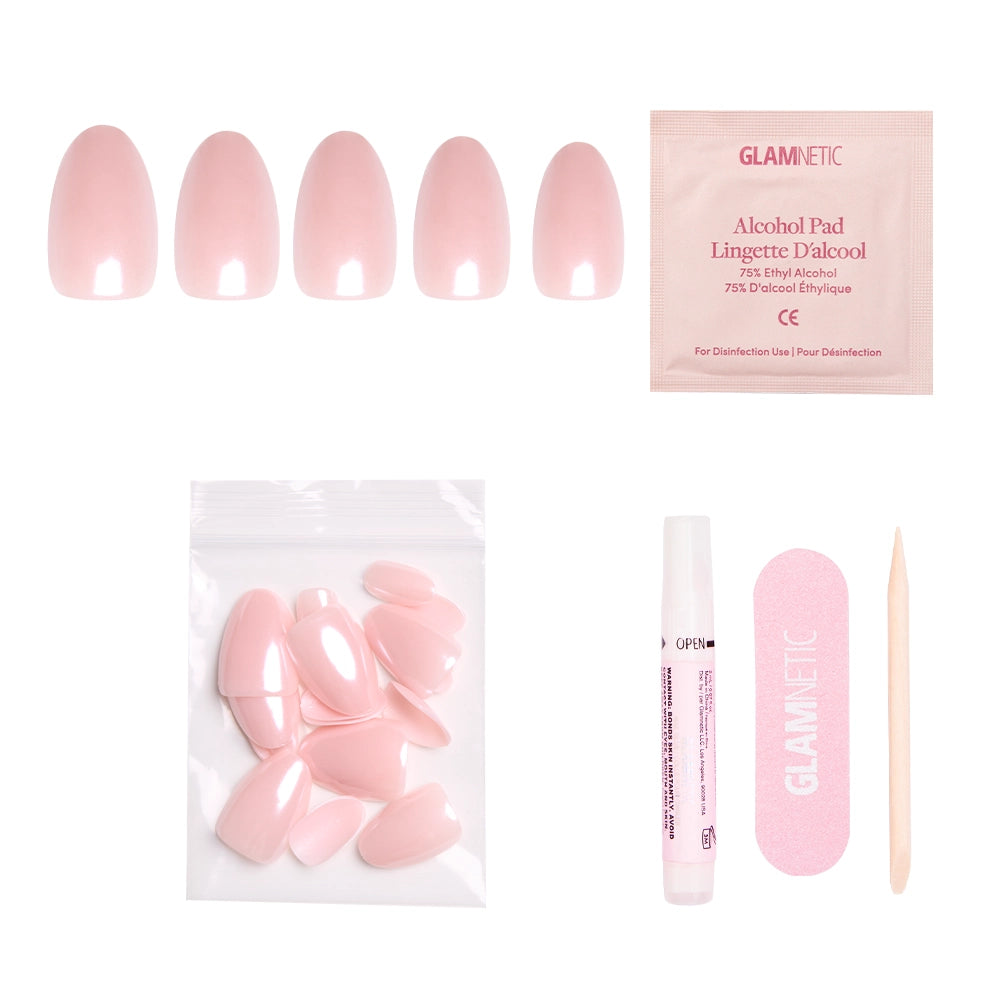 The Pinch Me Nail Set is perfect for the modern bride who wants sleek styles without trying too hard. The soft blush pink base and glossy glazed overlay create a delicate, barely-there look that’s effortlessly chic. Salon-quality and timelessly elegant, these short oval nails are versatile must-haves for engagement and beyond.