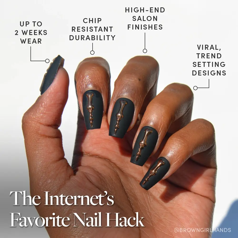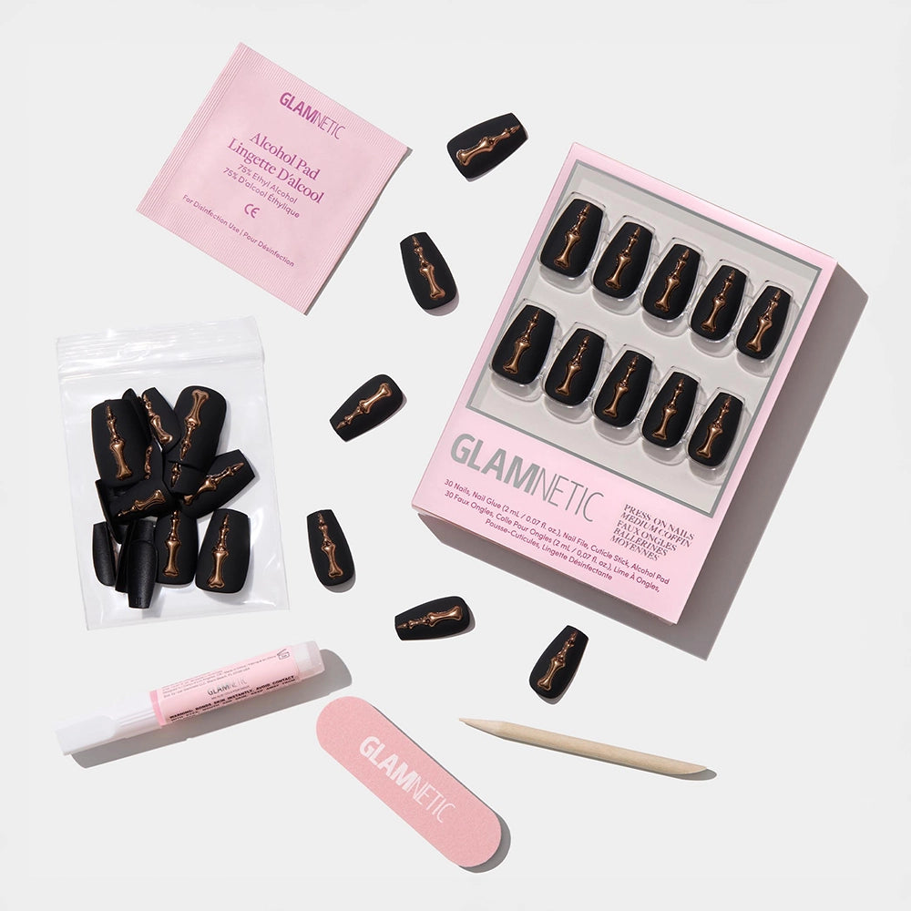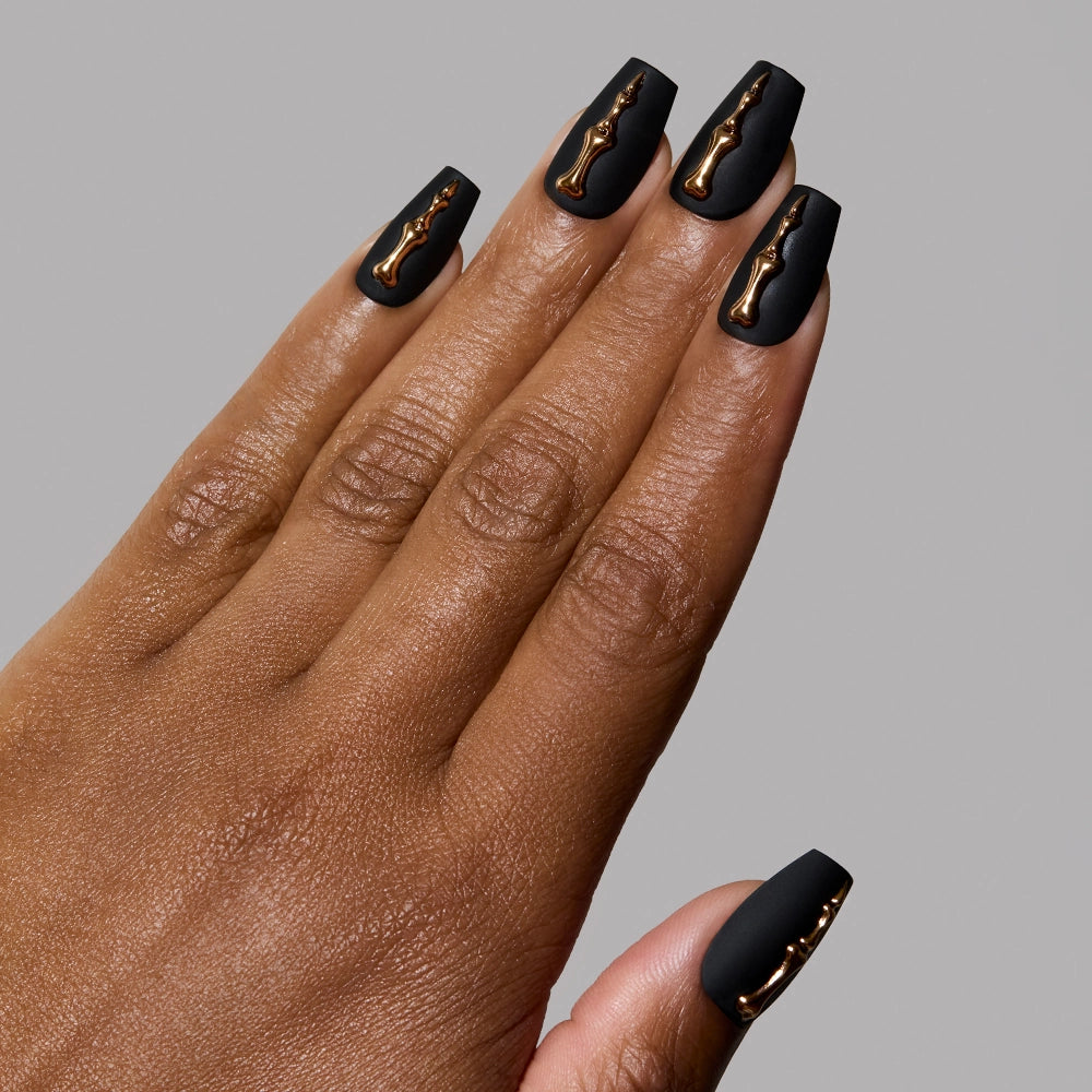 Elegance from the other side. Rosy Remains brings skeletal glamour to the show with rose gold 3D bone details laid across a matte charcoal coffin base. This is the kind of beauty that commands attention — both in the spotlight and in the shadows.